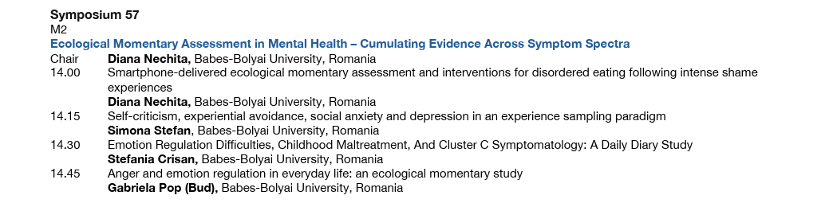 • Paper presented at the APR Conference: Nechita, D., Stefan, S., Matu, S., Crisan, S., Canache, M., Bud, G. , Cristian D. Transdiagnostic Processes in Eating Disorders and Self-Injurious Behaviors: A Meta-Analysis, APR Conference, Chisinau, June 2025
